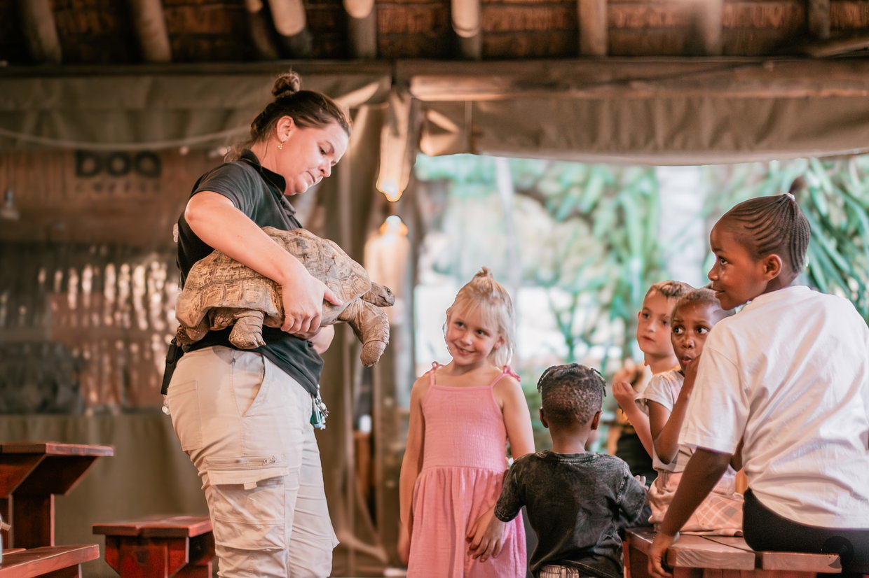 The reptile demonstration. For 15 to 20 minutes, the group steps into a different kind of experience. A Leopard Tortoise. Snakes. Movement. Texture. Questions. Reactions. The kind of encounter that replaces fear with understanding. Small group. Close. Real.