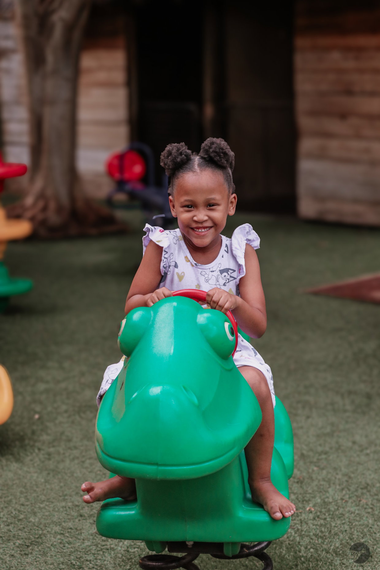 A play park. Seasonal water jets. Areas to run, pause, and reset. Parents step back while children move freely within a structured environment.